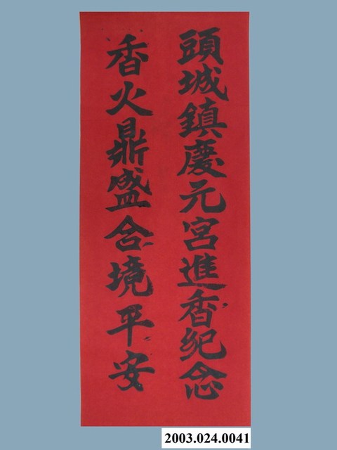 本件宜蘭頭城慶元宮進香紀念印記,以墨版蓋印於紅色紙張上,印記原版為清代製品,採直式戳印形式,以楷體鐫刻兩行文字「頭城鎮慶元宮進香紀念」、「香火鼎盛合境平安」,為製作進香彩帶所用之印記,分別標示於彩帶之兩邊。
