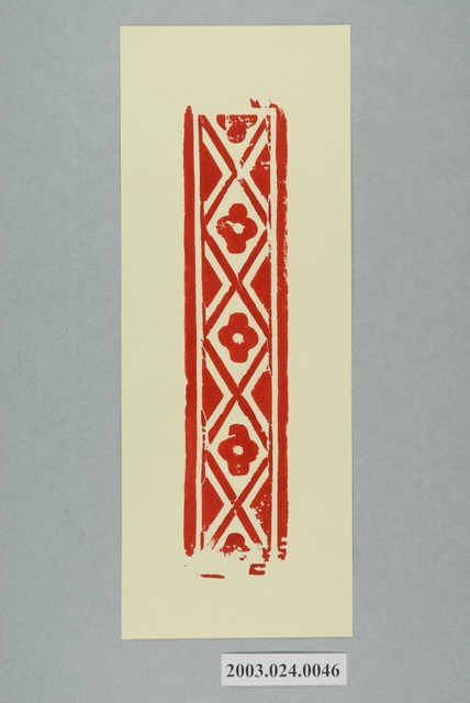本件紙錢紙邊印記以朱紅版印製於米黃色紙張上,印記雕版為清代製品,用於金紙之紙邊戳印。印記作長條形花邊形式,以內部作四辦花朵之菱形紋樣相連而成為二方連續圖案,上下各有直線,以之做為金紙之側邊裝飾。 傳統金、銀紙錢在印製時,除了每一張紙錢的正面印製紋樣與黏貼錫箔之外,在疊成一整束的金紙側邊也多會蓋上印記即紙邊印記,主要用於標示紙錢之種類,或是出品商號、品質說明等,以及純粹做為花邊裝飾者。