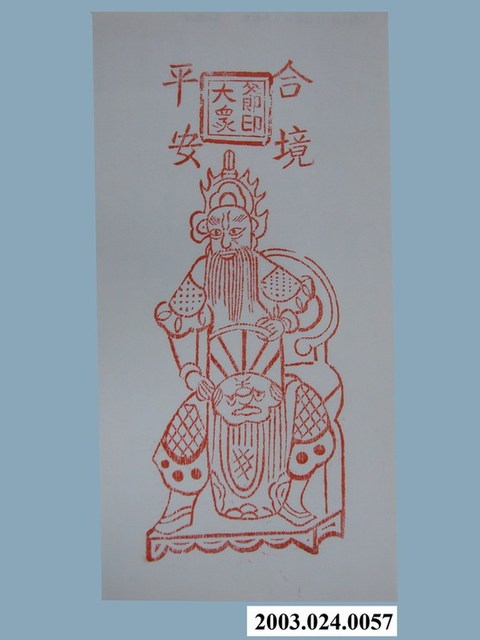 本件大眾爺版印神禡,以朱紅色版印製於白色紙張之上,原版為清代製品。畫面中作一位斜坐於圈背椅上的大眾爺像,本件神禡神像作古代武將造形,神像怒目、虯髯,頭戴戰盔,身穿甲冑,腹前有獅頭紋,為武大眾爺。右手置於右膝之上,左手握腰帶,左腿屈膝,右腿向外直伸。上方直書「合境」、「平安」兩行字,文字中間蓋一方法印,印文書「大眾爺印」。神像之造形與線條具有明顯拙趣。