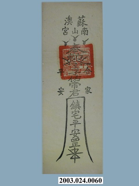 平安符是民間常見的符令,主要有鎮宅和隨身兩種功能。符令的結構一般可區分為符頭、符身、符腳三個部份,符頭多作佛道最高神的符號,如V;符身為符令的功能,如鎮宅平安、清淨;符腳為花押或是押「罡」字,以鎮符令。本件鎮宅符以孚佑帝君為名,勅令鎮宅平安,孚佑帝君即八仙中的「呂洞賓」,民間尊稱為呂仙祖、純陽祖師。