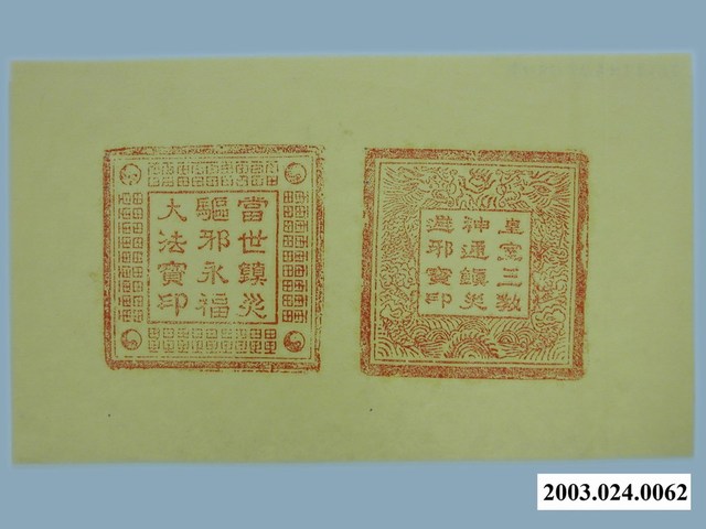 本件避邪與驅邪法印為兩方印文不同之法印,以朱紅印尼印製於黃紙之上。右側一方法印以粗細雙線為邊框,中央方框內鐫刻隸書體印文「皇寶三教神通鎮災避邪寶印」,印文周邊作雙龍搶珠紋飾。左側一方法印同樣以粗係雙線為邊框,中央方框內鐫刻隸書體印文「當世鎮災驅邪永福大法寶印」,其外四角作太極圖,上下左右四邊作九個「雷字」。