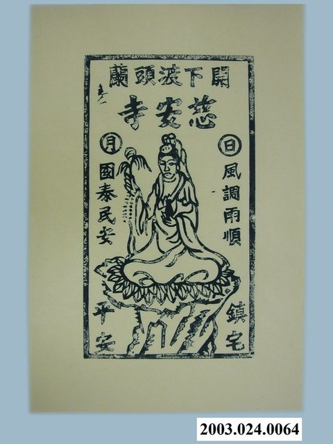 本件慈安寺觀音佛祖版印神禡,以墨版版印製於黃色紙張之上,原版為清代製品,屬宜蘭市慈安寺所有。神禡以粗黑線為邊框,上方兩排文字,上排兩側橫書「開蘭」,兩字之間書「下渡頭」,下排橫書「慈安寺」。文字下一尊白衣觀音佛祖像,觀音盤坐於大石上的蓮花座,右手上舉持柳枝,左手托一只淨瓶。觀音頭部兩側圓圈文字「日」、「月」,其下分別書「風調雨順」、「國泰民安」,石座左右書「鎮宅」、「平安」。