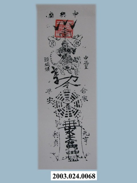 本件宜蘭頭城中興廟版印平安符以墨版印製於長條形符紙上,並加蓋朱紅法印而成。最上端書「中興廟」,符頭書「VVV」符號、「奉」並加蓋「二聖尊王」朱紅法印,其下為騎虎的玄壇元帥之像,兩側有文字「頭城鎮」、「中崙里」。符身書「勅令」、洛書八卦符號,八卦兩側為「合家」、「平安」。其次為七星符號,几字形線條內書「山水土」、三台符號、界、雷符號等,兩側書「元亨」、「利貞」,符腳押「罡」字,為鎮宅平安的符令。
