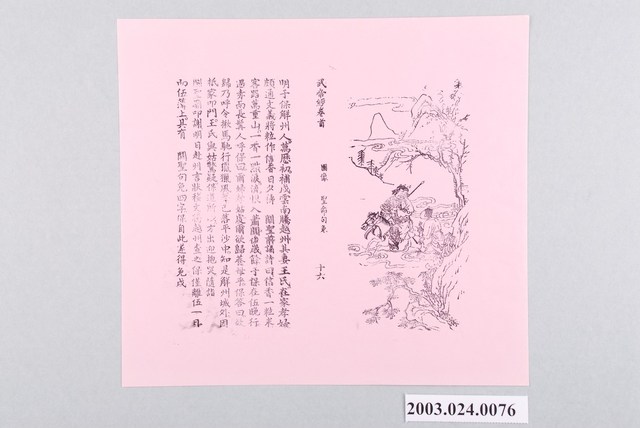 本件武帝聖命勾免圖以墨版印製於白紙上,原版為清代製品。書籍頁面未有版框,以版心區分為左右兩頁,裝訂時在版心處對摺。右頁圖面描繪明解州人于保與關帝馳返故鄉並得勾免戍任事蹟,畫面作山林背景,中央關帝戎裝持大刀騎馬,馬後跪一人,下方有雲朵。左頁為圖像之說明,文字描述解州人于保之妻王氏每日以米粒做香,祈求關帝使其夫能早日歸來。關帝顯靈馳于保歸家,並勾免無須戍任雲南。版心「武帝經卷首」、「圖像」、「聖命勾免」、「十六」,為經書之第十五頁。