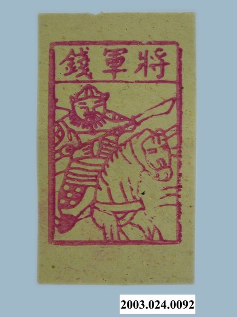 本件將軍錢紙錢以朱紅版印製於黃色草紙上,紙錢在方形邊框內上方橫書「將軍錢」三字,下方作古代武將,面有虯髯,身穿盔甲,雙手持大刀,跨坐於馬上。