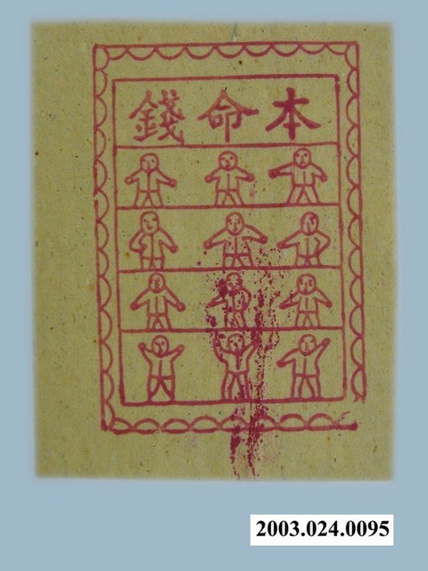 本件本命錢紙錢以朱紅版印製於黃色草紙上,紙錢在方形花框內上方橫書「本命錢」三字,下方以橫現劃分為四格,每格作三位人形,共十二位,象徵人的十二元神。 紙錢為金銀紙中的一類,多用於特殊儀式中,類型十分多元。本命錢之功能,與十二元神錢類似,主要為聚合元神以召回心神,補強本命以利元辰光彩,並化解咸池、劫煞等厄難,一般多用於制解、補運儀式中,以小三牲等祭品禳祭關煞,以本命錢強化元辰,並以替身代替本人而承受厄運。