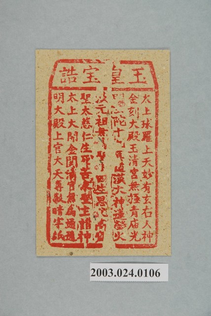 本件玉皇寶誥紙錢採直幅構圖,以朱紅版印製於黃色草紙上。紙錢在上方梯形框內橫書「玉皇寶誥」四字,下方方形框內作七行文字:「太上球羅,上天妙有,玄右人神,金刻大殿玉清宮,無極青庙,光明○陀十○○,○漢大神蓮,瑩火次元祖,無○聖○,四生思父高○聖,太慈仁生死苦,求聖主諸神,太上大開金關,清官無為,通隨明大殿,上官大天尊,敬暗字紙」,因版印有缺損而部份文字無法辨識。