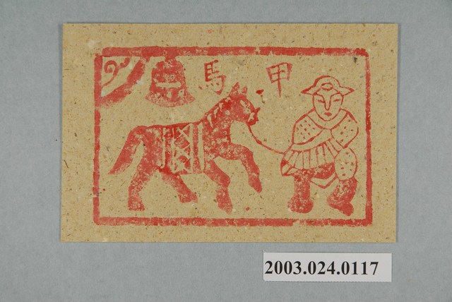 本件甲馬紙錢為常見的橫幅式,以朱紅色版印製於黃色草紙上,畫面作方形邊框,上端中央有「甲馬」二字,左側掛一只銅鐘,下方右側一名作士兵裝束的馬伕,正面朝前,雙手拉一條疆繩,繩子連接左側一披紅色戰馬,馬背披有馬鞍。