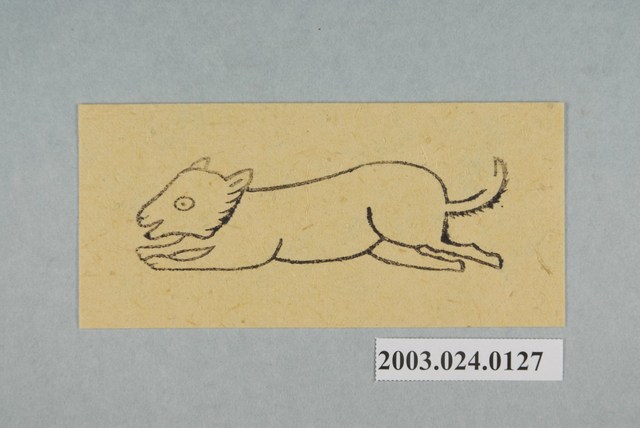 本件天狗像為民間制解法事中使用,以墨版印製於黃色草紙上,畫面中作一隻白狗,頭朝左方,口部微張,眼睛圓滾,尾巴上翹,前肢前伸,後肢後伸,作趴伏於地面之姿態。