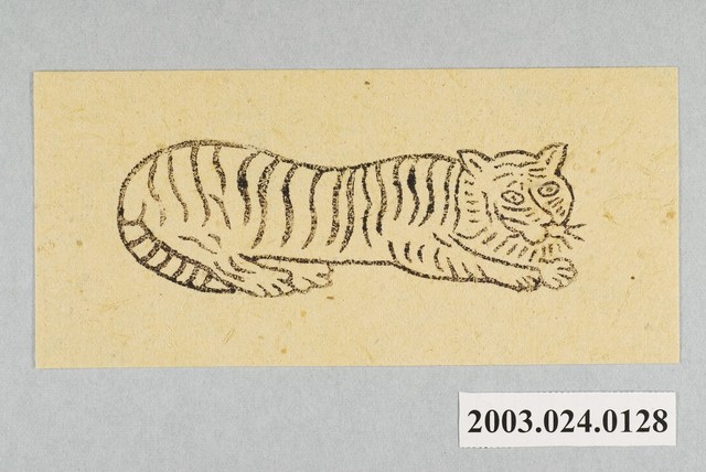 本件白虎像為民間制解法事中使用,以墨版印製於白色紙張之上,白虎作頭朝右、尾部回捲,前肢前伸,後肢朝前,趴伏於地上的姿態,雙眼露出凶光,身上的虎班紋路相當明顯。