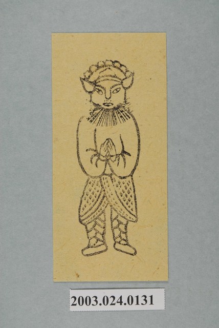 本件煞神像為制解關煞之一,以單一墨色印製在黃色的草紙之上,煞神頭部在兩側鬢角長犄角,頭戴冠,面部虯髯而形貌兇惡,上身穿袖口束口上衣,下身穿兩片式獸皮裙,小腿打綁腿,雙手於胸前作合十姿勢。