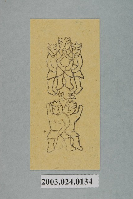 本件五鬼像為制解關煞之一,以單一墨色印製在黃色的草紙之上,畫面中央橫書「五鬼」二字,上下方各作兩群鬼,上方三名、下方兩名,每位鬼皆作頭長犄角、上身赤裸裝束,下身穿短裙。