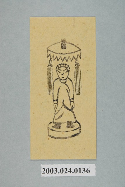 本件傘任像以單一墨色印製在黃色的草紙之上,畫面上方作一頂圓形平頂華蓋式涼傘,傘的下端作鋸齒狀,兩側垂有流蘇裝飾。傘下立一人,頭部盤髮辮於上額,身穿圓領及腳長袍,雙手下垂置於兩腿旁,腳穿黑色短靴,立於圓臺之上。