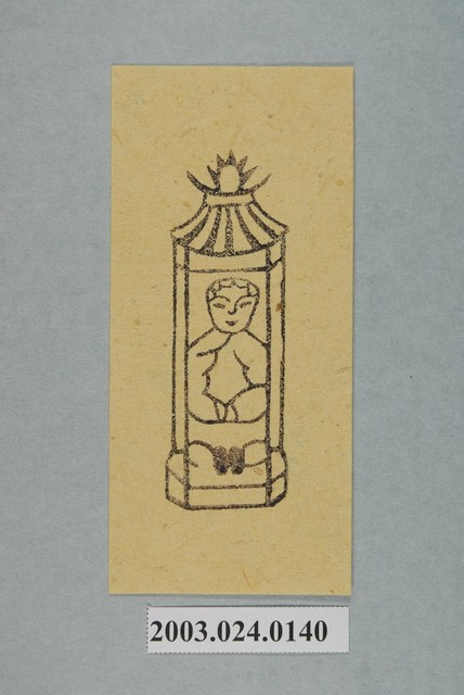 本件病符像為制解關煞之一,以墨版印製在黃色的草紙之上,畫面中作一座傳統六角形屋頂之涼亭,亭中一短髮男子,身穿長袖上衣與長褲,雙手於腹前作合十姿態,雙腿往前盤曲,作打坐姿態。