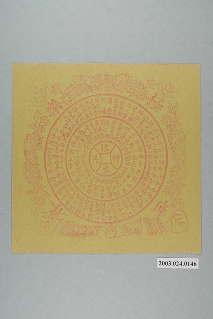 本件往生紙錢在黃色草紙上以單一朱紅色印製往生咒文字,文字以同心圓方式分兩圈排列其中,最中心為古銅錢圖樣,中央一個「卍」字,四邊書「往生神咒」四字,其外兩圈為漢文往生咒文字。四個角落有「極」、「樂」、「世」、「界」文字,上方與兩側有繁複的蓮花紋樣,為晚近常見的式樣。