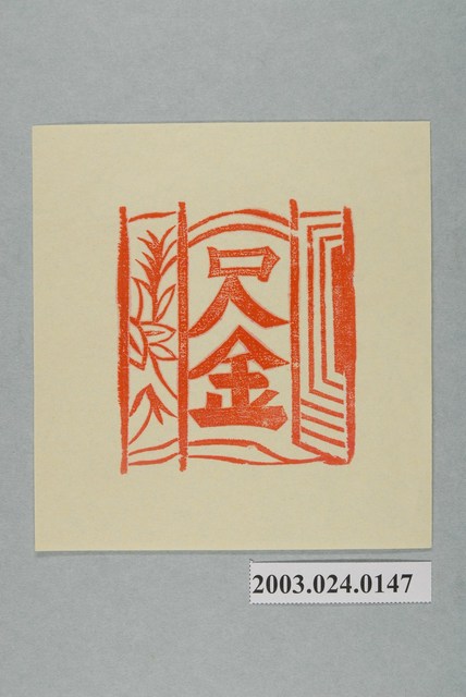 本件尺金紙邊印記以朱紅版印製於米黃色紙張上,印記雕版為日治時期製品,用於金紙之紙邊戳印。印記作展開畫卷形式,中央在上下雙線內作「尺金」二字,右側為方框形回文線條,左邊為花草紋。