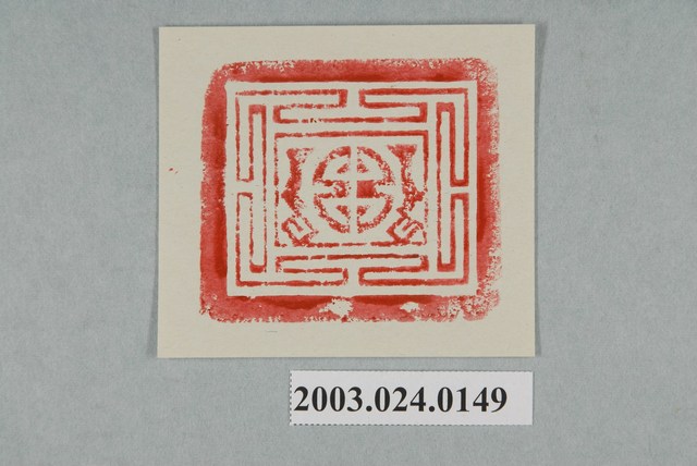 本件壽金紙面印記以朱紅版印製於米黃色紙張上,印記雕版為清代製品,用於壽金紙面戳印。印記作橫式長方形左右對稱式樣,畫面正中作一圓形之壽字白文,周邊圍繞方回文朱文線條,邊框作粗線方框,線條紋路已有缺損現象。