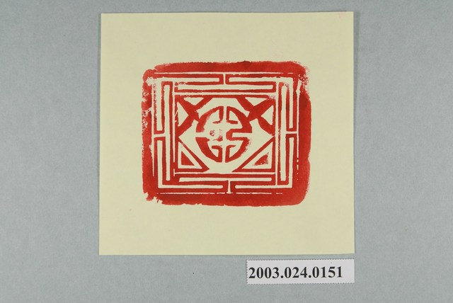 本件壽金紙面印記以朱紅版印製於米黃色紙張上,印記雕版為清代製品,用於印製壽金之紙面。印記作橫式長方形左右對稱式樣,畫面正中作一圓形之壽字白文,四角為等邊三角形紋,周邊圍繞方回文朱文線條,邊框作粗線方框。整體線條紋路已有缺損現象。