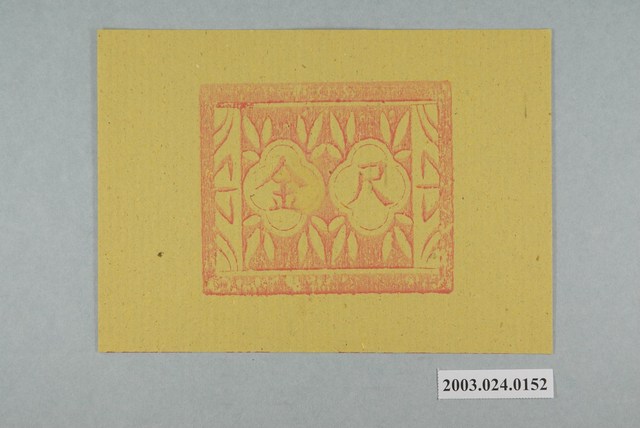 本件尺金金紙以朱紅色版印製於黃色草紙之上,作長方形橫幅形式,在粗線方形邊框之內,中間在兩朵四瓣花朵內橫書朱文「尺金」二字,花朵外圍作白文葉片紋樣,兩側又有草紋裝飾,紙面中央原貼有一小張錫箔,但已脫落。 尺金為金銀紙錢中的金紙類,主要用於祭祀玉皇大帝、三官大帝等上界神祇,常與天金一起交雜合用,販售時兩者有交錯相疊,或是一面為天金另一面為尺金之情形,常見於臺灣中部地區。