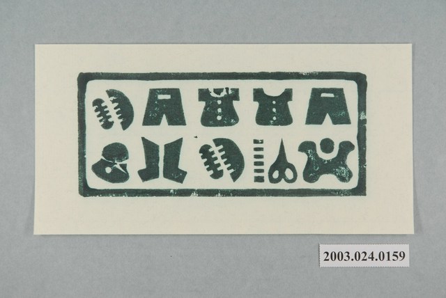 本件經衣紙錢印記以墨綠色版印製於黃紙上,原版為日治時期製品。在橫式長方形粗線框內排列有剪刀、梳子、鏡子等梳洗用具,以及上衣、裙子、褲子、靴子、帽子等衣物,紋樣形式粗獷。