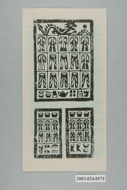 本件經衣紙錢印記以墨版印製於黃紙上,原版為日治時期製品。版面區分為上下兩部份,上段為一方框,框內分為四列,由上至下有龍搶珠、袍、褲、裙、壺、杯、盆、梯、火爐等物。下段為兩並列直框,框內都分為四列,有盆、袍、褲、梳、桶等物。