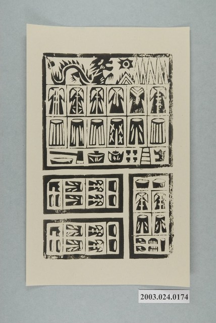 本件經衣紙錢印記以墨版印製於黃紙上,版面區分為上下兩段,上段為一大方框,下段為三長框。上段方框分為四列,圖案由上至下有龍搶珠、洋裝、裙、褲、盆、斧、鍋、壺、杯、梯、火爐等。下段右側一直框,左側上下兩橫寬,直框內圖案有盆、洋裝、褲、鞋、梳、杯等,兩橫框圖案相同,由右至左有盆、洋裝、褲、烘爐、盤等。
