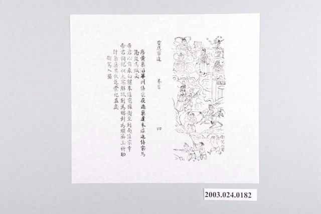 本件文昌帝君站立雲端施法,旁立朱衣及魁星。後半葉附圖說:「唐黃巢陷華州,僖宗夜遁,巢遣朱溫追僖宗,馬斃,幾為賊及,帝君以自乘白騾奉僖宗,擁衛至劍南。僖宗幸帝君祠,祀以太牢,解佩劍為贈,封為順濟王,祈助討巢,巢果伏誅,崇祀益虔。」