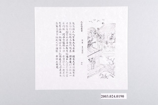 本件武帝經卷首圖像帝訓避邪,上半葉圖像繪武帝像於房內,狐魅離去的景象。下半葉圖說岩錢盈移居,「鄰言此房甚凶,夜有狐魅弄人,盈不答,於堂屋內挂關帝聖像,棹上供帝寶訓文一冊,晨起焚香跪誦一徧,僕婦見許多狐魅,乘月色遯去,再無影響,且事事順利,人皆謂敬帝訓之報焉。」