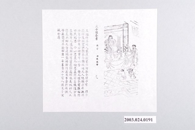 本件關帝經卷首圖像神庥得子,上半葉繪圖關聖於廟內受王開祚跪求子的圖像。下半葉圖說,廟祝言以無子必有因,開祚「因思帝以忠義而神,忠義故非易稱,隨分自應勉力,凡遇親朋中,有窘處險處則伏義慨助之,又倡義共助之,每逢朔望將所行某某事登於冊,供帝座前,甫年餘,即生一子。享壽七十有八,猶見子食餼於庠。」