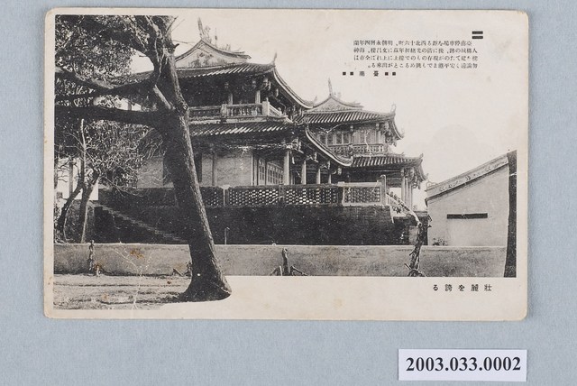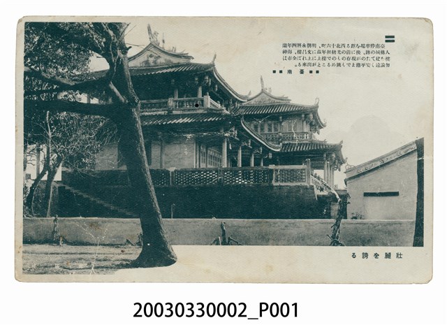 1.本物件為以赤崁樓為主題之明信片,正面為赤崁樓黑白照片,畫面為赤嵌樓之側景,站於赤崁樓右側城牆上向樓城取景,其華麗輝煌之氣勢,帶給人崇敬的感受,右上有1段文字「臺南停車場を距る西北十六町,明朝永曆四年蘭人構城の跡,後に清の光緒初年茲に文昌樓,海神樓を建てたのが現存のもので樓上に上れば全市は勿論遠く安平港までも晀めることが出來る。臺南」,大意為在臺南停車場西北約1750公尺處,明朝永曆4年荷蘭人所建城之遺跡,現存建物為清光緒初年增建文昌閣、海神樓,於城樓上可望建全市,甚至到安平港,右下有1段文字「壯麗を誇る」,左下有1段文字「赤崁樓」;背面為空白明信片直式書寫面,以黑色單色印刷,左上有郵票黏貼處,內有「切手」字樣,左側有1鳥樣式圖案,中央有「後銃よめ固線戰べ偲」字樣。2.赤崁樓係西元1653年由荷蘭人所建,時稱普羅民遮城、プロビンシヤ城址、紅毛城;1661年鄭成功驅逐荷蘭人後將此樓稱為承天府以統治臺灣,1879年清廷在此基礎上建文昌閣、海神廟與蓬壺書院,西元1895年後曾作為陸軍衛戍醫院及臺南師範學校使用。現存建物為其殘跡,以及海神廟與文昌閣。