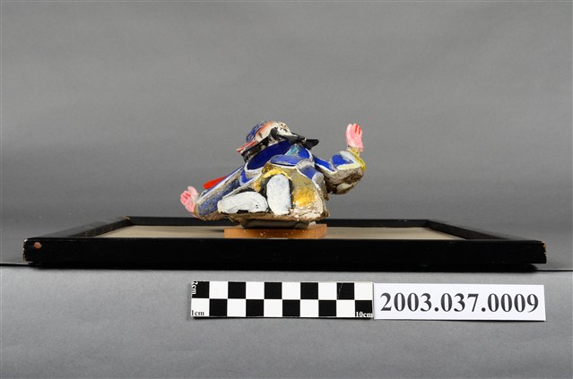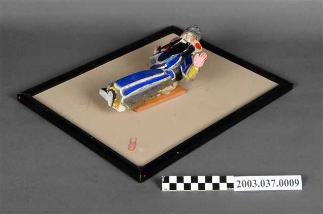 1.本件剪黏人物,採玻璃剪黏作法,由剪黏司傅陳乞及其徒弟陳世仁等人製作而成,原位於大稻埕慈聖宮前殿水車堵。人物造型為老年文人,雙手張臂微舉,面朝左回看,雙腳往左。瓷燒偶頭,髮上有髻,蓄鬚垂胸,身穿深藍色長袍,以白漆勾勒出衣飾線條。依黃于恬研究指出,文人穿藍色官服者通常為宰相。