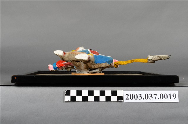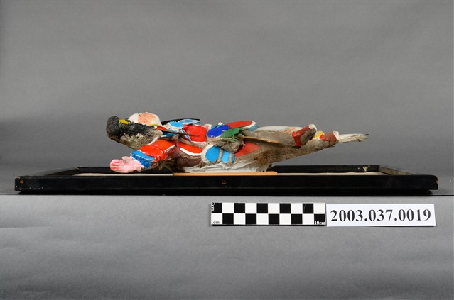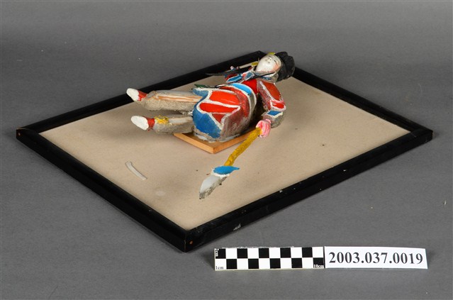 1.本件剪黏人物,採玻璃剪黏作法,由剪黏司傅陳乞及其徒弟陳世仁等人製作而成,原位於大稻埕慈聖宮前殿水車堵。人物造型為女將,左手持長槍、右手伸直上舉,面朝左回看,左腳往右跨出。瓷燒偶頭,髮上梳髻,身穿紅色上衣、白色褲子,肩上搭以水藍色領巾,腰帶繫以圓珠墜飾,並以白漆勾勒出衣飾線條。