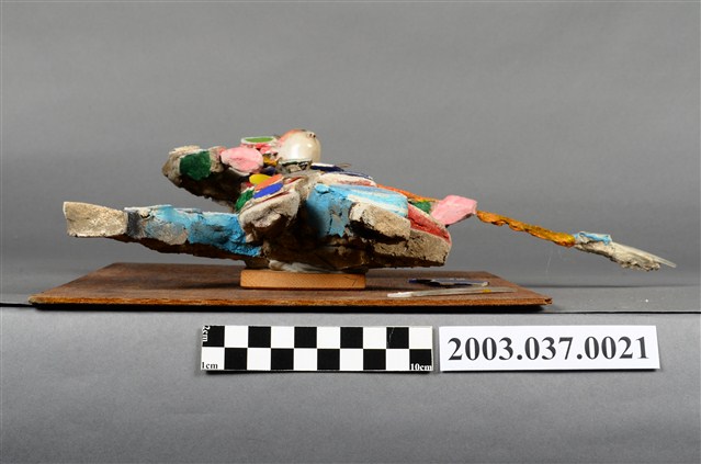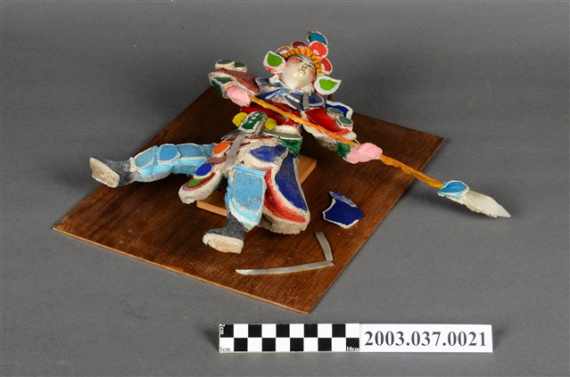 1.本件剪黏人物,採玻璃剪黏作法,由剪黏司傅陳乞及其徒弟陳世仁等人製作而成,原位於大稻埕慈聖宮前殿水車堵。人物造型為青年武將,雙手持長槍平舉,面朝左回看,右腳抬高往右跨出。瓷燒偶頭,頭戴盔帽,身穿紅色戰甲、深藍色長袍、水藍色褲子,肩上搭以深藍色領巾,腰帶繫以圓珠墜飾,並以白漆勾勒出衣飾線條。武將一般武齣題材的主角人物。