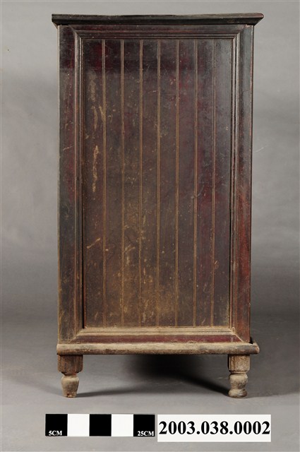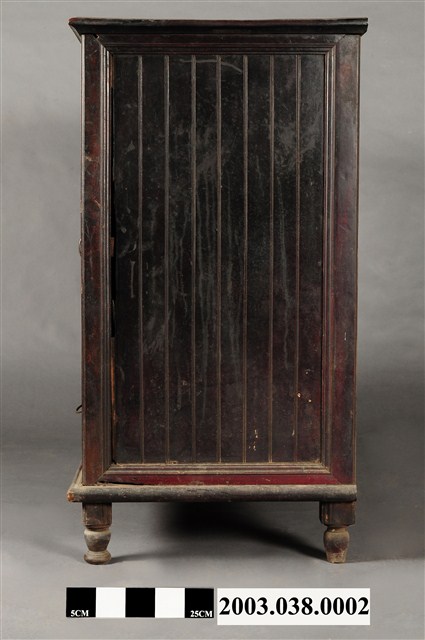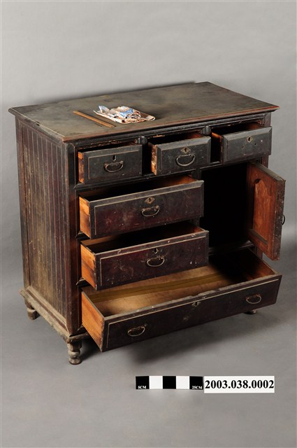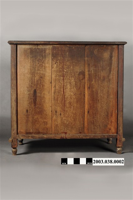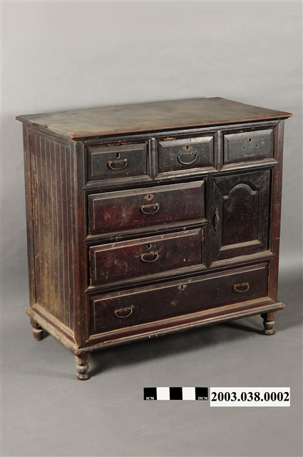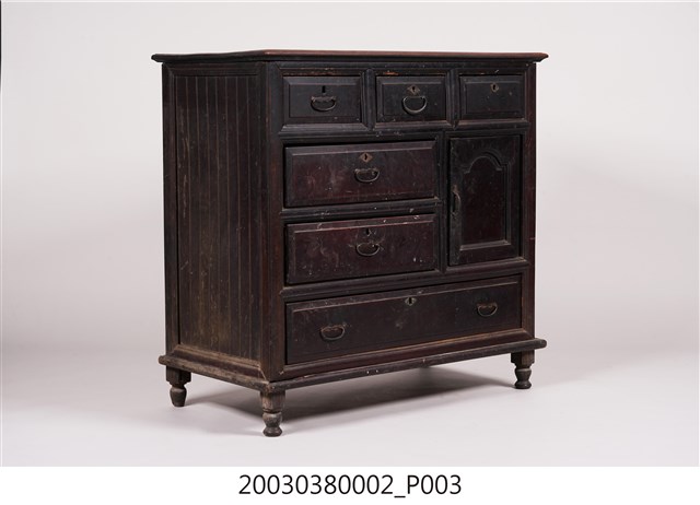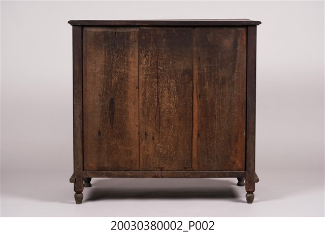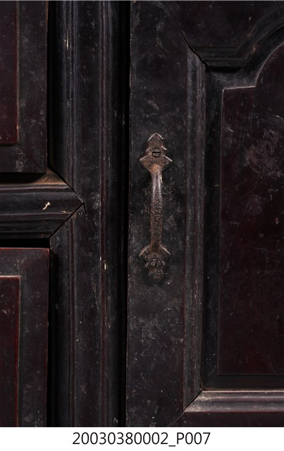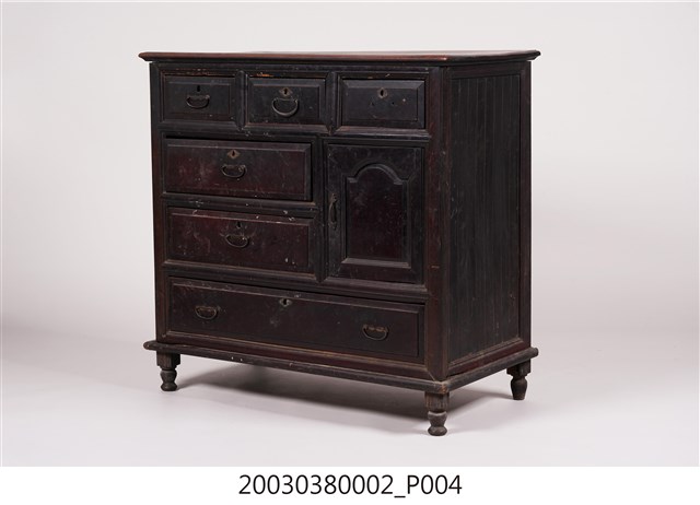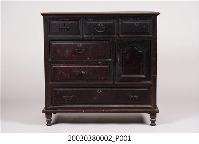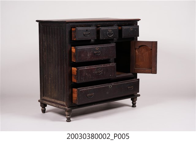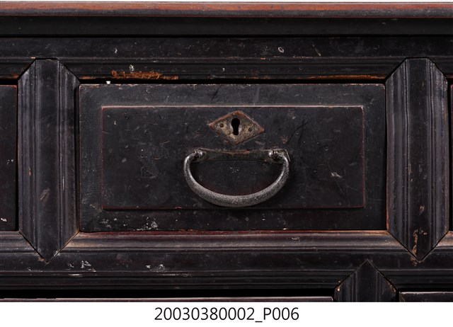 1.本藏品為木製乾漆車枳矮櫃,長100公分、寬52公分、高97公分,櫃身方直,頂板與底板突出,底板下做有車枳圓形四足。櫃身可分為三層,最上層為並列的三個抽屜,每個抽屜中央原皆做有一個金屬橢圓形屜環,屜環上方有鎖孔,最右側抽屜的屜環已經拖落,但仍可見痕跡。中層左側為上下兩個抽屜,同樣做有橢圓形金屬屜環與鎖孔,右側是一個小櫥,櫥門做有拱門線腳,櫥門左邊則有金屬拉把。櫃子的最下層則為一個大抽屜,做有左右兩個金屬橢圓形屜環,中央上端有鎖孔。櫃子通體施以乾漆,整體給人典雅實用之感。