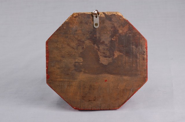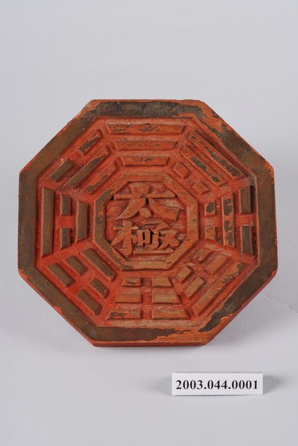 本件太極八卦牌以木雕彩繪方式製作,外型作正八邊形。中心鐫刻太極二字,其外圍繞八個卦象,採乾、坤二卦上下相對,為先天八卦排列方式。太極與八卦卦象以紅色為底施黑漆,太極、卦象符號作黑色,黑漆近半脫落。