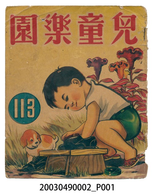 1.本件為「《兒童樂園》113期封面」,此件為散頁,是《兒童樂園》第113期封面。傷損嚴重,表面泛黃,邊角多處破損,整張紙皆起皺,導致部分畫面有剝落現象,四邊皆有斷裂、破損痕跡,此書右側裝訂。