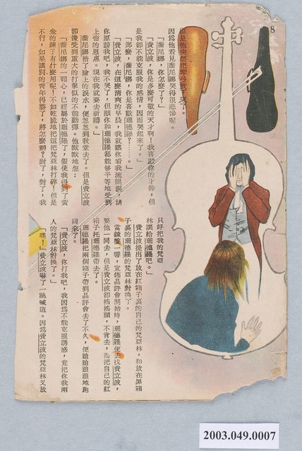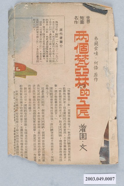 1.本件為「〈兩個梵亞林的工匠〉故事紙本散頁」,此件為散頁,傷損嚴重,表面泛黃,邊角多處破損,整張紙皆起皺,導致部分畫面有剝落現象,四邊皆有斷裂、破損痕跡,三折式。2.開頭的小框為法國文學家,也是原作者弗蘭索哇.柯倍的簡介。故事內容以圖文並茂的方式呈現。
