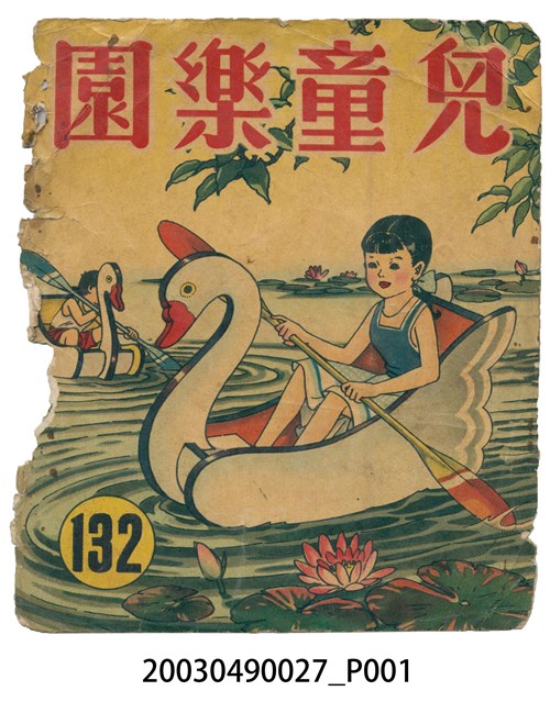 1.本件為「《兒童樂園》132期封面」,此件為散頁,是《兒童樂園》第132期封面。表面泛黃,右上角起皺,褐斑多集中左側,而左側邊傷損嚴重,有破洞、斷裂等現象,右側邊也有破損痕跡。