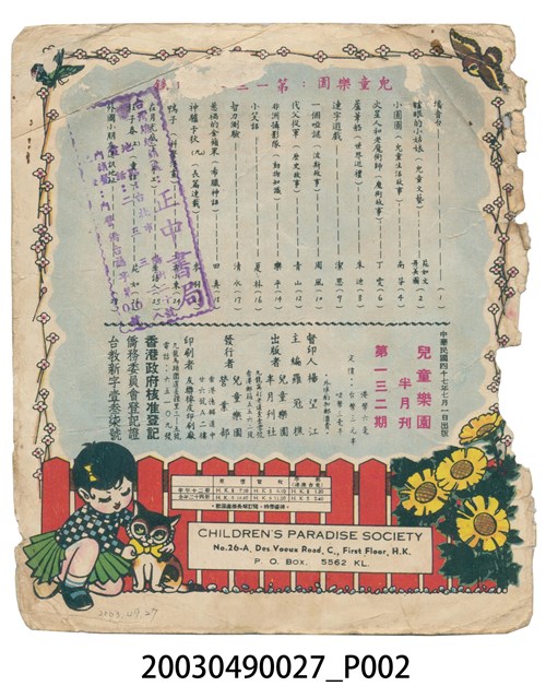 楊望江督印,羅冠樵主編,兒童樂園半月刊社出版、兒童樂園營業部發行、友聯橡皮印刷廠印刷