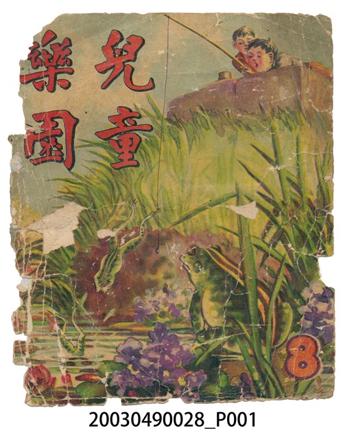 1.本件為「《兒童樂園》8期封面」,此件為散頁,是《兒童樂園》第8期封面。傷損嚴重,表面泛黃,邊角多處破損,整張紙皆起皺,導致部分畫面有剝落現象,四邊皆有斷裂、破損痕跡。
