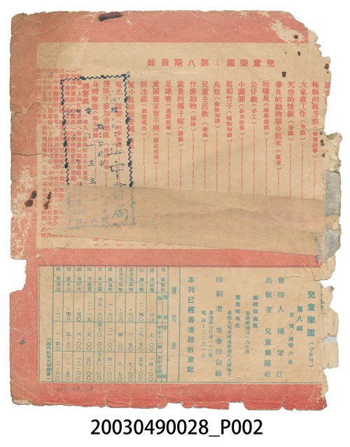 楊望江督印,兒童樂園半月刊社出版、兒童樂園營業部發行、友聯橡皮印刷廠印刷