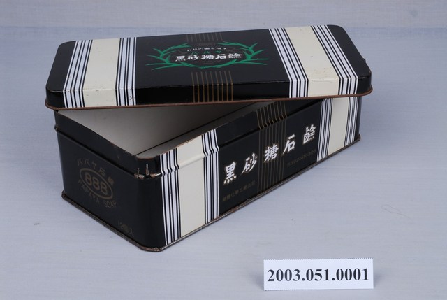 一、本文物為黑砂糖石鹼之鐵盒,一共分為鐵盒與上蓋兩個物件。以黑底搭配黑白與金色相間的條紋,而鐵盒上有多處的刮痕與生鏽。此文物則是放入黑砂糖石鹼肥皂的鐵盒,為當時清潔肌膚的民生用品。