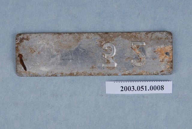 1.本物件為1張金屬製的方型鐵牌,正面有上漆,背面則無。鐵牌的左右2側各打了1個圓形小洞。正面全上白色底漆,文字及標誌部分則無上漆或是灰黑色漆,左邊有臺灣電力公司的標誌,右邊則是數字「32」,正面整體而言,小洞部分有紅色鏽斑,白色部分邊框呈片狀掉漆,中間則有灰色星狀掉漆貌;背面則呈金屬原色,左邊的小洞有個金屬零件,疑似是釘子,生鏽嚴重,右邊則有「32」數字的反向,推測為正面鑄刻文字的痕跡。反面有許多生鏽紅斑,基本上由邊框延伸。