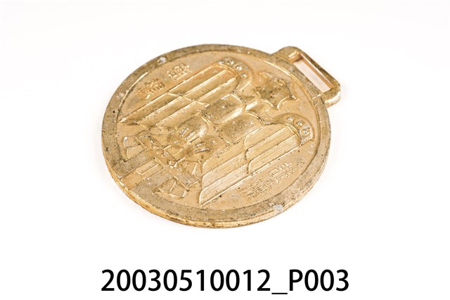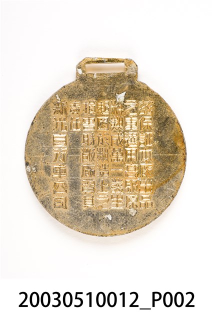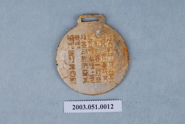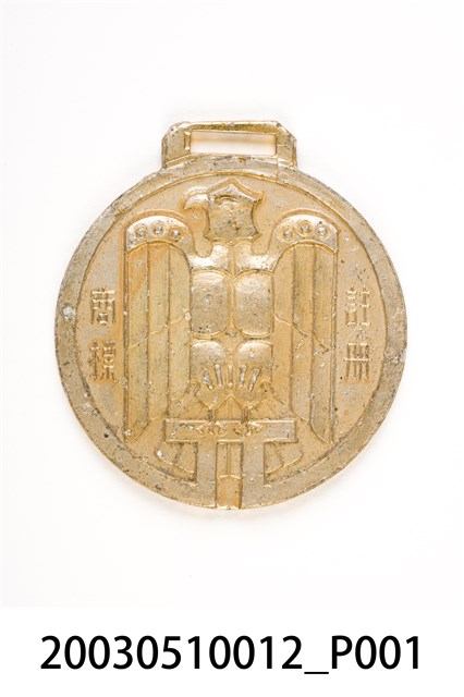 1.本物件為新光自行車公司獎章,金屬材質。該物件外觀為圓形,正面可見1隻老鷹商標、「註冊商標」 字樣,物件背面可見「茲保證本廠出品之車選用高級原料製成萬一業主起因於製造商損害時敝廠負其責任」、「新光自行車公司」浮刻字樣。