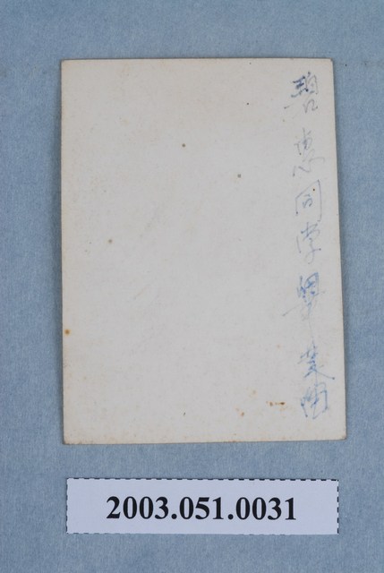 1.本物件為碧惠之大頭照。物件本體為一張直式黑白照片,左下角有一片汙漬。圖像中女子旁分齊耳短髮,身穿繡有「省立善中」及學號的制服,身體端正面向鏡頭。物件背面寫有文字:碧惠同學畢業留。