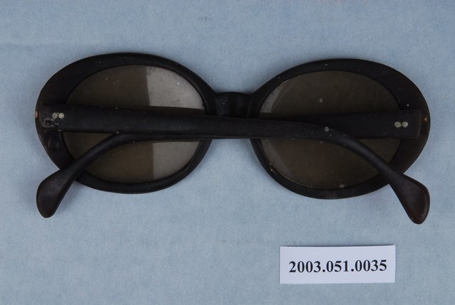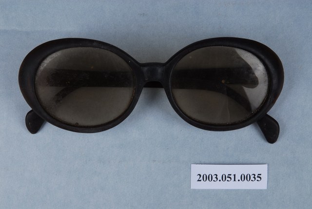 1.此眼鏡為橢圓黑色膠框,由於稍有年份或保存不當,鏡片部分部分模糊不清透,鏡框有多處磨損,鼻托變色混濁,左側鏡架與鏡框相接處有明顯磨損,鏡腳則相對完整。2.本件為呂理政先生採集。眼鏡自清代即有使用紀錄,原本為奢侈品,且流行於文人間,還有裝飾精美的眼鏡袋。隨著年代變遷,眼鏡逐漸成為尋常之物。