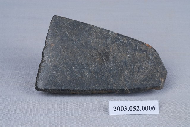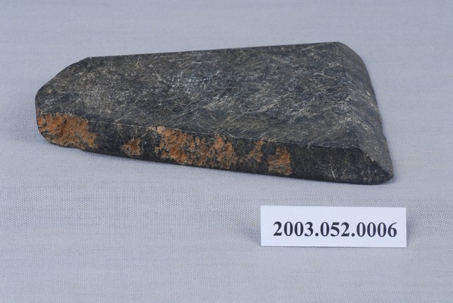 本件磨製石錛採集地點不明,長7.8cm、寬5cm、厚1cm。器形近梯形,器壁厚度均勻,光滑平整,柄部有崩鋸痕跡並缺一角,刃端較寬,刃部為偏鋒,有使用痕,刃部背面耗損。