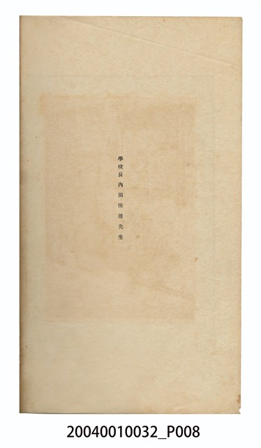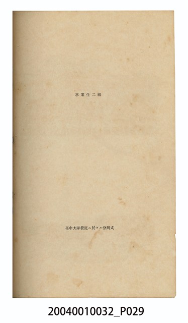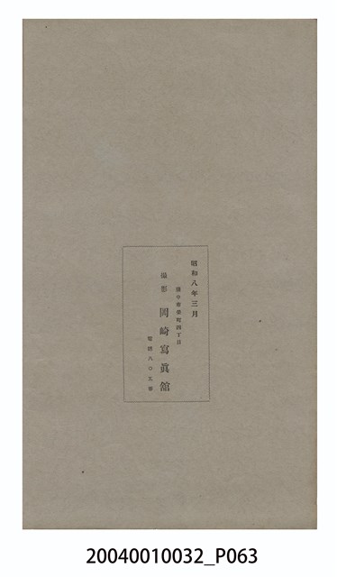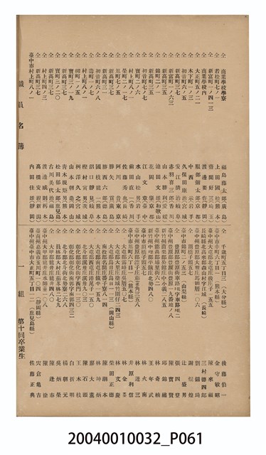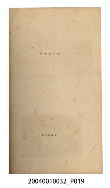 本件為《臺中商業學校第10屆畢業紀念冊》,製作時間為昭和8年(1933年),雙孔線裝,黑白印刷,製作者為臺中市岡崎寫真館。內容主要為校園景觀照、教職員、學生大頭照、畢業班級及社團團體照、校園生活照等,尾頁附有教職員及畢業生名冊。臺中商業學校(今國立臺中科技大學),於1919年創設,初名為「臺灣公立臺中商業學校」,並借用當時的「臺灣公立高等普通學校」(今臺中第一高級中學)校舍授課,至1921年更名為「臺中州立臺中商業學校」,隨後將校址移往臺中州大屯郡北屯庄的臨時校舍內,至1927年新校舍陸續竣工後,於1929年完成遷校。該校名沿革,如下:1919年,臺灣公立臺中商業學校;1921年,臺中州立臺中商業學校;1945年,臺灣省立臺中商業職業學校;1963年,臺灣省立臺中商業專科學校;1982年,國立臺中商業專科學校;1999年,國立臺中技術學院;2011年,國立臺中科技大學。