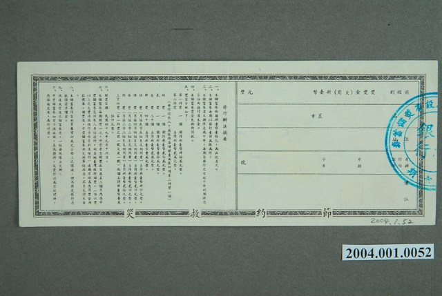 1.本物件為八七水災區復興建設有獎儲蓄券,材質為紙。本物件正面中央建築圖案以綠色印刷,上、下側以紅色印刷花邊,右側以紅色字印「第壹期」及「新台幣拾元」及底圖。中央圖像上方印「八七災區 復興建設有獎儲蓄券」紅字,圖像下方印「臺灣銀行發行」,花邊下方印「臺灣銀行印刷所」。左側則印編號「A810217」紅字、「董事長」、「總經理」及其印,最左側印「中華民國四十九年一月一日」,中央及右側各有一道折痕。物件背面印有裝飾方框,右側蓋有一藍色圓形騎縫章,有「設有獎儲蓄券」、「銀行」、「壹期」等字樣。方框右半部為收據欄,左半部為發行辦法摘要,下方印「節約救災」字樣。