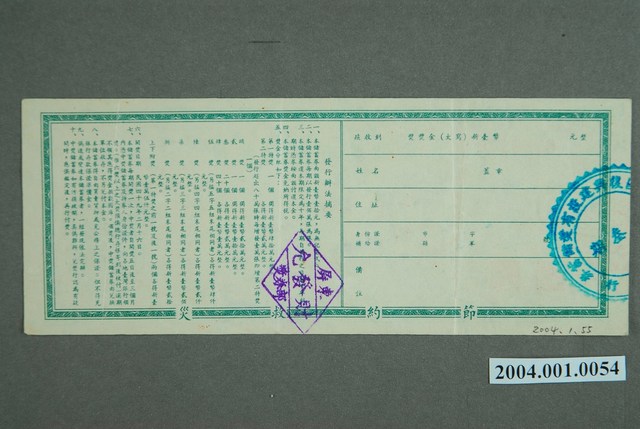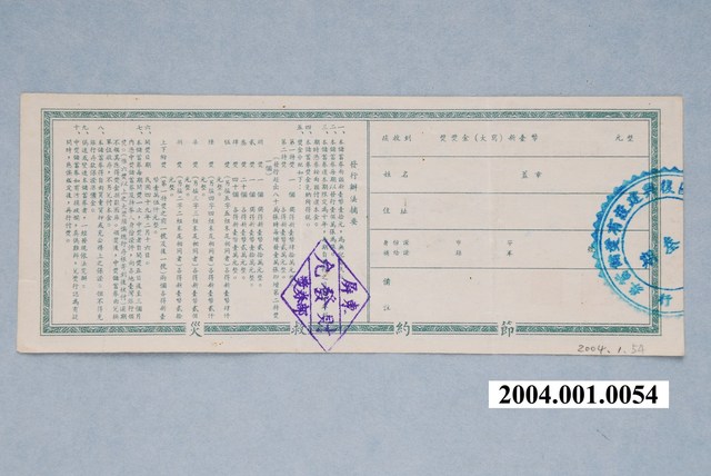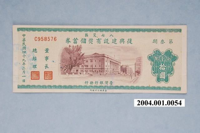 1.本物件為八七災區復興建設有獎儲蓄券,材質為紙。本物件正面中央建築圖樣為紫褐色,餘採綠色印刷。上、下兩側有花邊飾條。右側印「第参期」、「新臺幣拾圓」及底圖。中央圖樣上方印「八七災區 復興建設有獎儲蓄券」字樣,圖樣下方印「臺灣銀行發行」、花邊飾條下方印「臺灣銀行印刷所」。左側上方印有編號「C958576」紅字、「董事長」、「總經理」綠字及其印,最左側印「中華民國四十九年一月十六日」,券面有三道明顯折痕。物件背面印有綠色花邊方框,右側蓋有一藍色圓形騎縫章,上有「復興建設有獎儲蓄券」、「参期」、「行」等字樣。方框右半部為收據欄,左半部為發行辦法摘要,下方印「節約救災」字樣。中央偏下方印有一紫色菱形印,上有「屏東」、「允發財」、「獎券部」字樣。